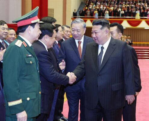 Tổng Bí thư Đảng Lao động Triều Tiên, Chủ tịch Quốc vụ nước Cộng hòa Dân chủ Nhân dân Triều Tiên Kim Jong Un đón Tổng Bí thư Tô Lâm. (Ảnh: Thống Nhất/TTXVN)