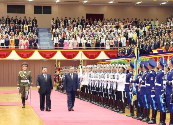 Tổng Bí thư Tô Lâm và Tổng Bí thư Đảng Lao động Triều Tiên, Chủ tịch Quốc vụ nước Cộng hòa Dân chủ Nhân dân Triều Tiên Kim Jong Un duyệt Đội danh dự. (Ảnh: Thống Nhất/TTXVN)