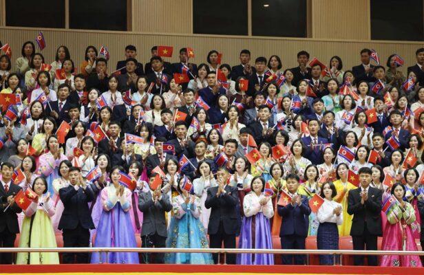 Quần chúng nhân dân Triều Tiên tham dự Lễ đón trọng thể Tổng Bí thư Tô Lâm và Đoàn đại biểu cấp cao Việt Nam thăm cấp Nhà nước tới Triều Tiên. (Ảnh: Thống Nhất/TTXVN)