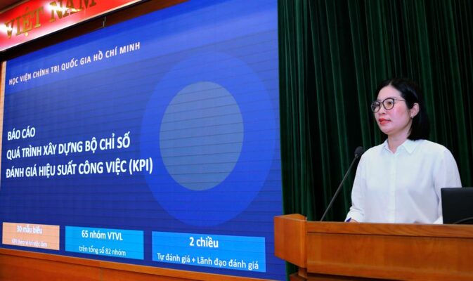Tại hội nghị, TS Ngô Thị Hải Anh, Phó Vụ trưởng Vụ Tổ chức cán bộ, Trưởng Ban Thi đua – Khen thưởng Học viện trình bày báo cáo về việc xây dựng và áp dụng Bộ chỉ số đo lường hiệu quả công việc (KPI) gắn với nhật ký công việc, đây được xác định là giải pháp đột phá nhằm đổi mới căn bản phương thức quản lý, hướng tới sự công bằng, minh bạch và nâng cao hiệu quả hoạt động trong toàn hệ thống Học viện Chính trị quốc gia Hồ Chí Minh.
