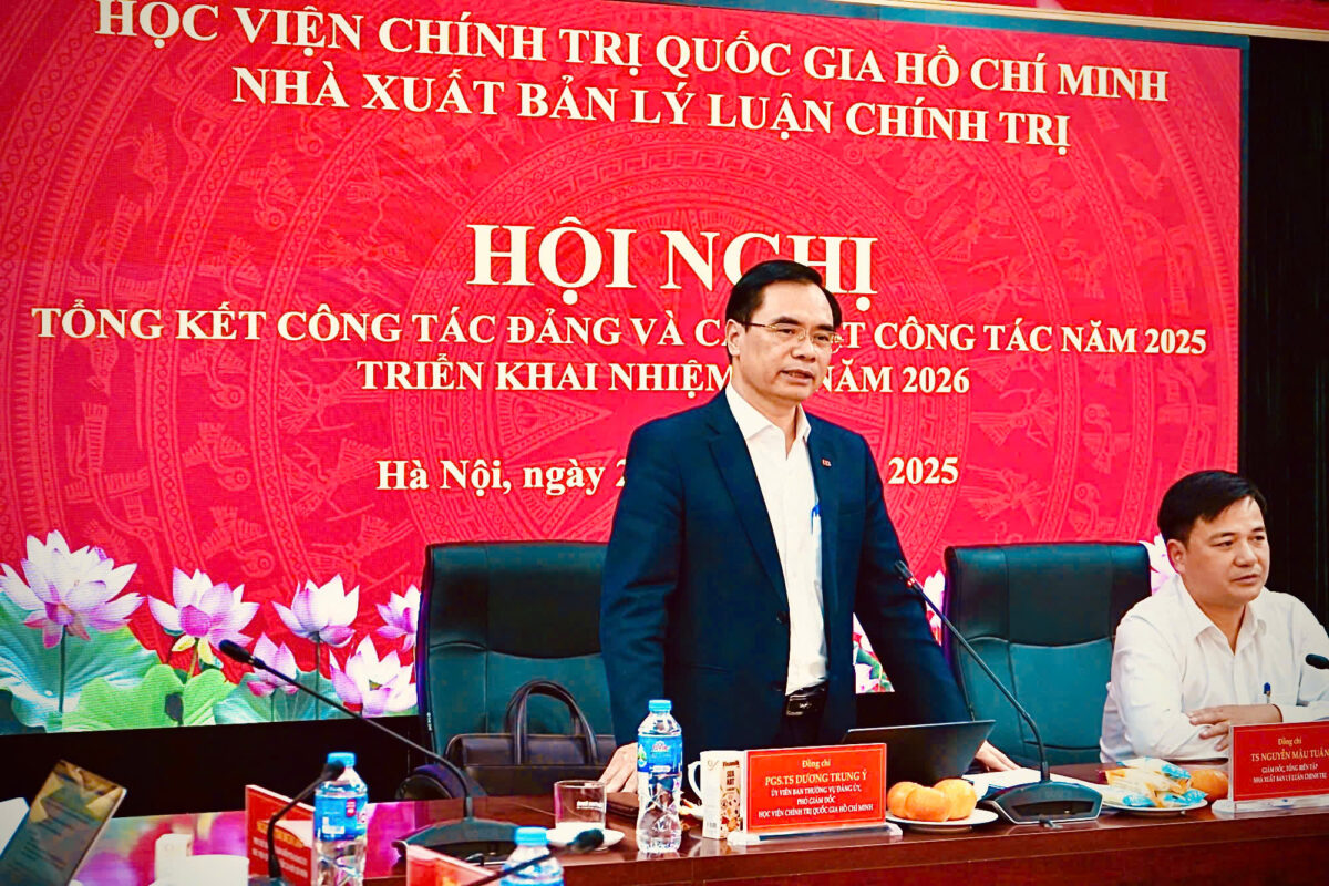 Phát biểu kết luận Hội nghị, PGS,TS Dương Trung Ý, Uỷ viên Thường vụ Đảng uỷ, Phó Giám đốc Học viện, bày tỏ sự vui mừng trước những thành tựu, chuyển biến tích cực và dấu ấn rõ nét mà Nhà xuất bản Lý luận chính trị đã đạt được trong năm 2025. Đồng chí đánh giá cao các kết quả nổi bật của đơn vị trong năm qua; đồng chí Phó Giám đốc Học viện chỉ đạo Nhà xuất bản tiếp tục triển khai đồng bộ, đầy đủ phương hướng, nhiệm vụ đã nêu trong báo cáo; đồng thời phải quán triệt sâu sắc Nghị quyết Chi bộ nhiệm kỳ 2025–2030, bám sát Nghị quyết Đảng bộ Học viện và các chủ trương, quyết sách mới của Đảng, Nhà nước trong quá trình xây dựng kế hoạch công tác năm 2026. Đồng chí Phó Giám đốc Học viện nhấn mạnh năm 2026 phải được xác định là năm đẩy mạnh chuyển đổi số toàn diện hoạt động của Nhà xuất bản; trọng tâm là phát triển nguồn nhân lực, đổi mới phương thức đánh giá hiệu quả công việc dựa trên tiến độ, chất lượng và sản phẩm đầu ra, qua đó nâng cao tinh thần trách nhiệm và tính chuyên nghiệp của đội ngũ cán bộ, viên chức, người lao động.