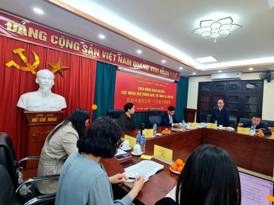 TS Nguyễn Mậu Tuân trao đổi với đồng chí Lưu Song Yến, Trưởng phòng Hợp tác Quốc tế, Cục Ngoại văn Trung Quốc
